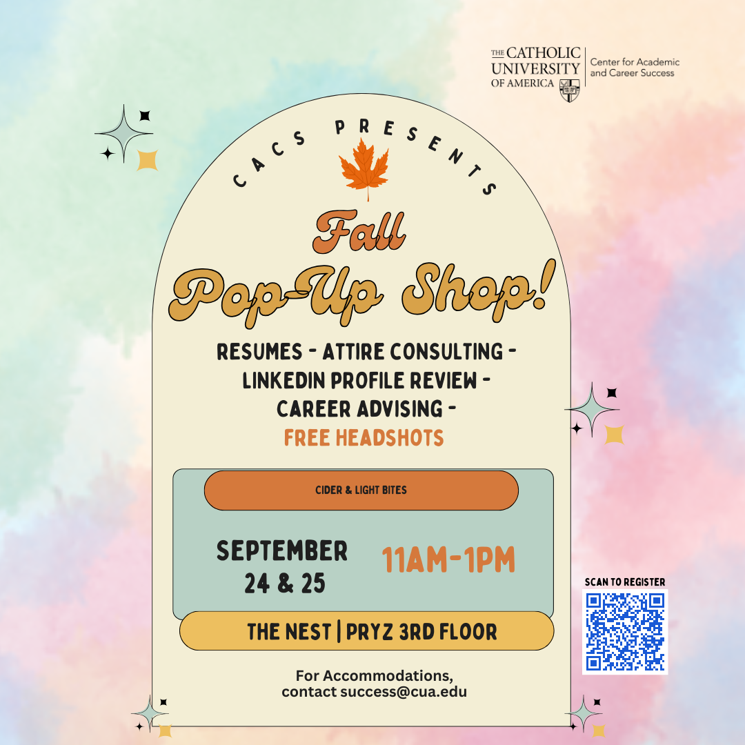 Take advantage of the upcoming Pop-Up Shops hosted by the Center for Academic and Career Success! On September 24 & 25 from 11-1 in The Nest, CACS will offer valuable services like resume reviews, attire consulting, LinkedIn profile feedback, and career advising on the spot! Students can even get a free professional headshot to enhance their online presence. This is a great opportunity for them to prepare for the upcoming career fair and other networking events!